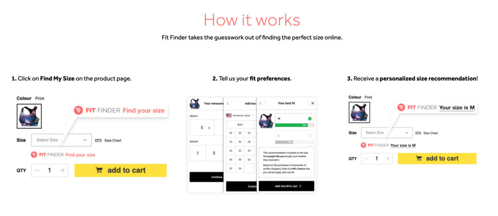 Lack of understanding about new technologies like Fit Finder can affect customer engagement. Shoppers will generally use the site elements with which they are familiar such as size charts or looking at customer reviews. Increasing familiarity with Fit Finder and how it works is an important step in boosting customer engagement. It’s important to offer a dedicated space where the Fit Finder process is outlined and easy to understand so the shopper feels secure in using the solution. This doesn’t have to be complicated – it can be as simple as a landing page with some images or a Fit Finder FAQ.