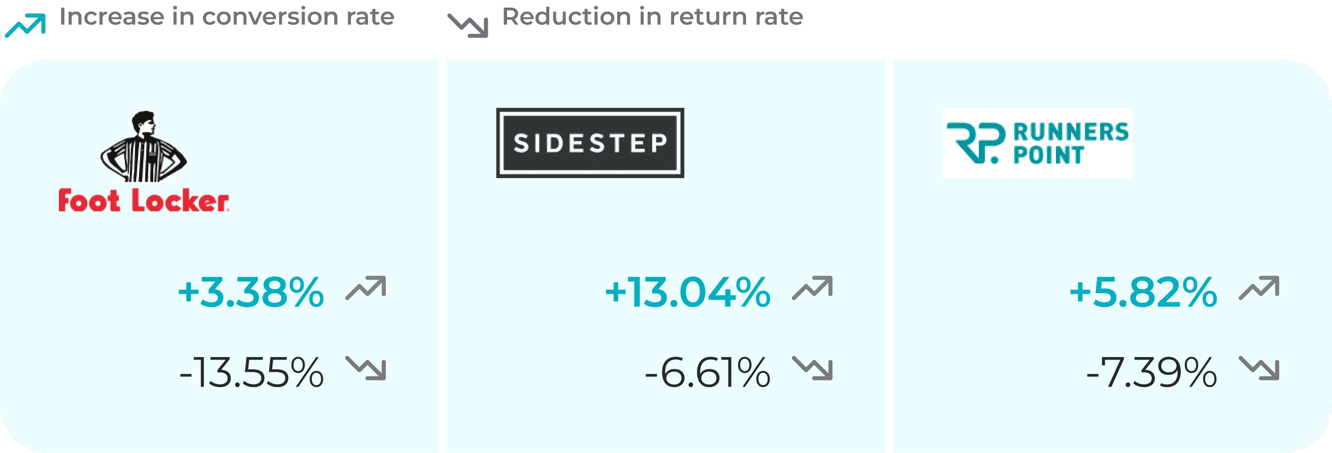 Results were equally impressive on the returns side of the equation: Foot Locker EU saw an impressive 13.55% reduction in return rate (RR), SIDESTEP RR decreased by 6.61%, and Runners Point RR decreased by 7.39%.